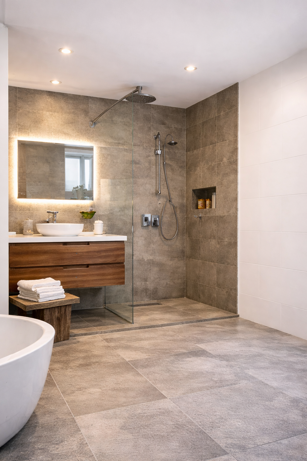 Edle graue Fliesen und klare Linien für ein zeitloses, großzügiges Raumgefühl.