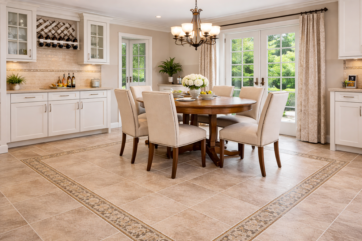 Großflächige Verlegung mit dekorativen Akzenten, die Ihren Wohnbereich zu etwas Besonderem machen.