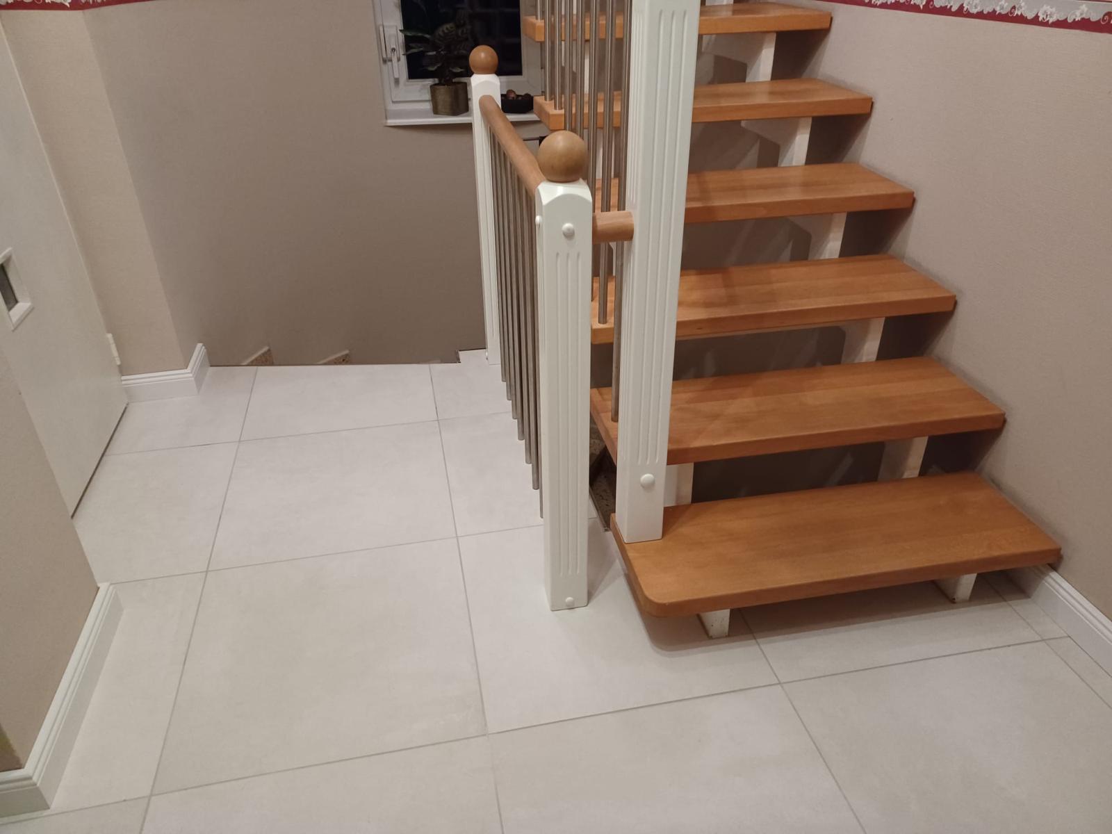 Helle Bodenfliesen, die für einen freundlichen Empfang sorgen und perfekt mit Ihrer Treppe harmonieren.